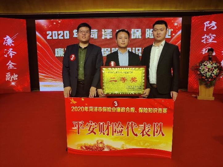 11月13日下午,由菏泽银保监分局主办,菏泽保险行业协会协办的“全市保险业行业合规、保险知识竞赛”在菏泽艺达酒店隆重举行,山东平安产险菏泽中支参赛团队经过紧张准备、充分应战,沉着发挥,在此次竞赛的47家财产险、寿险公司中脱颖而出,以总成绩第二名荣获二等奖,在全市财产险公司中名列第一,受到菏泽银保监分局领导的充分肯定和当地媒体的大力赞扬。