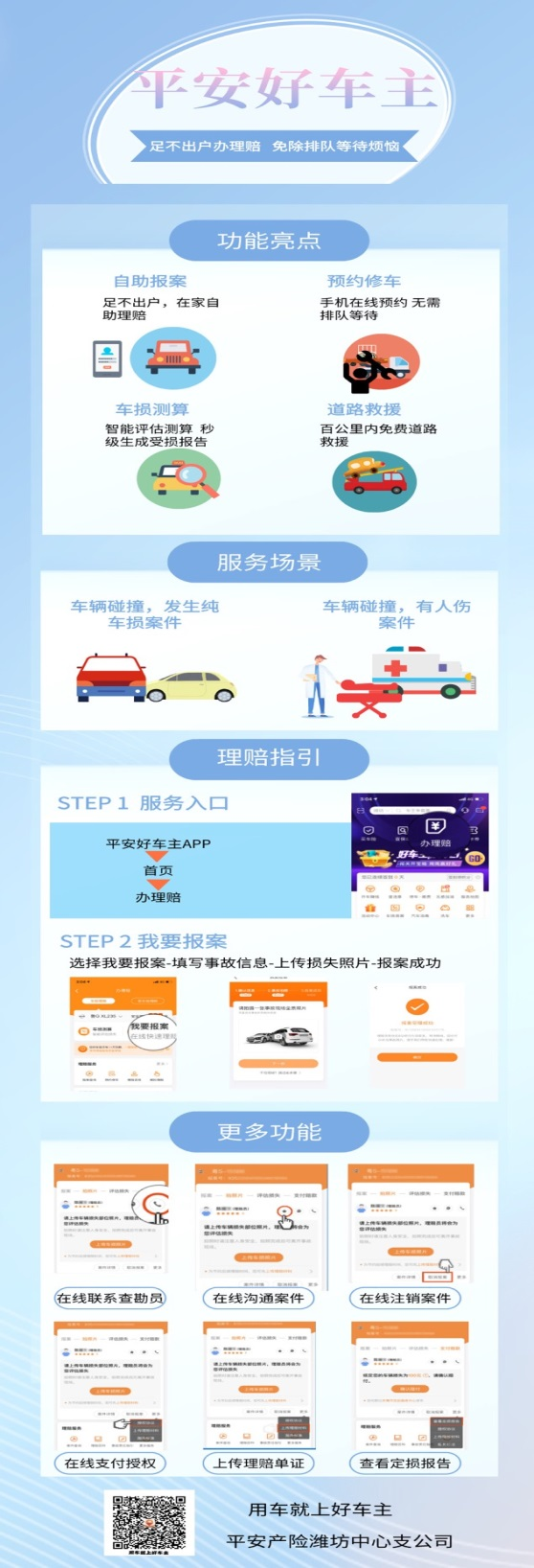 现场也通过易拉宝、海报等形式提醒广大平安车主如果出险,无需等待现场查勘到场,只需要打开平安好车主APP,通过首页中的“办理赔”服务,即可实现自助报案、自助上传事故现场图片、理赔咨询、自助咨询、自助索赔授权等,实现线上全流程的理赔服务,让您不出门也能尽享服务。