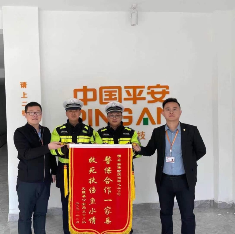 近日,平安产险山东分公司滨州中支收到无棣县交警赠送的锦旗,警保合作一家亲、救死扶伤鱼水情,短短几个字表达了无棣交警对无棣支公司服务